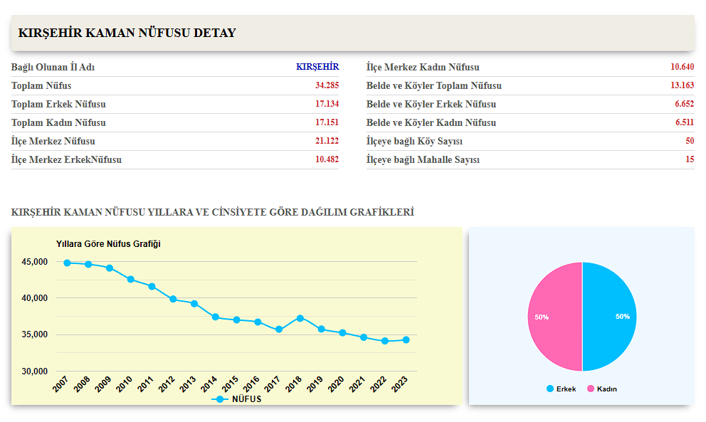 Kırşehir'e 52 km, Ankara'ya 130 km uzaklıktadır. Denizden yüksekliği ortalama 1.075 m olan ilçenin yüzölçümü 1.365 km² olup, toplam nüfusu 64.415'tir. İlçeye karasal iklim hakimdir. Kışları kar yağışlı, soğuk ve sert, yazları ise kurak ve sıcaktır. En fazla yağmur ilkbaharda görülür. Kaman ilçe sınırları içerisinde orman yoktur. İlçenin ekonomisi; dokumacılık, tarım ve hayvancılığa dayalıdır. Yetiştirilen başlıca tarımsal ürünler; hububat, baklagiller, yem bitkileri, endüstri bitkileri, sebze ve meyvedir. Özellikle Kaman cevizi ilçe ekonomisinde önemli bir yer tutmaktadır.[4] Hayvancılıkta büyük ve küçükbaş hayvanın yanı sıra tavukçuluk, arıcılık, balıkçılık ve devekuşu yetiştiriciliği yapılmaktadır. Hirfanlı Barajı'nda ve çeşitli göletlerde tatlı su balıkları bol miktarda olup, sazan, mercan, yayın, kadife, levrek, turna gibi türler bulunmaktadır.[5][6]
